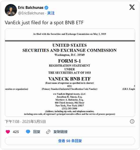 另一个备受关注的催化剂是美国投资公司VanEck提交的BNB ETF申请。市场普遍预期该产品有望在2025年内获得监管批准,如果成真,将吸引大量机构资金流入。ETF的批准将为传统投资者提供一个便捷的投资BNB的渠道,从而扩大BNB的市场需求。