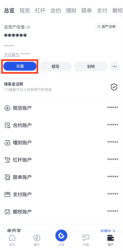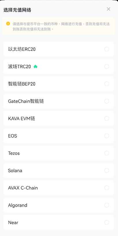 或者点击“现货账户”,在搜索栏中搜索需要充值的币种,点击进入该币种页面后,点击“充值”。 - 选择“链上充值”后,选择币种和充值网络。