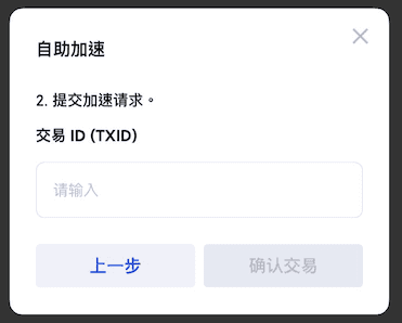 - 在弹出窗口中输入该笔充值的交易ID (TxID)后,点击”确定“,提交后耐心等待即可。