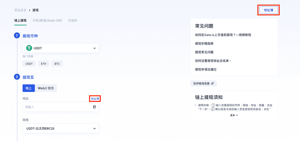 登录 Gate 个人账户,点击页面右上角“资产”—“资金管理”—“提现”—“链上”。