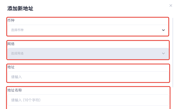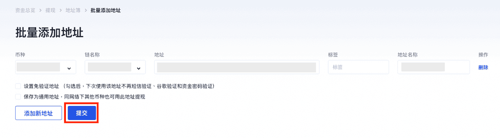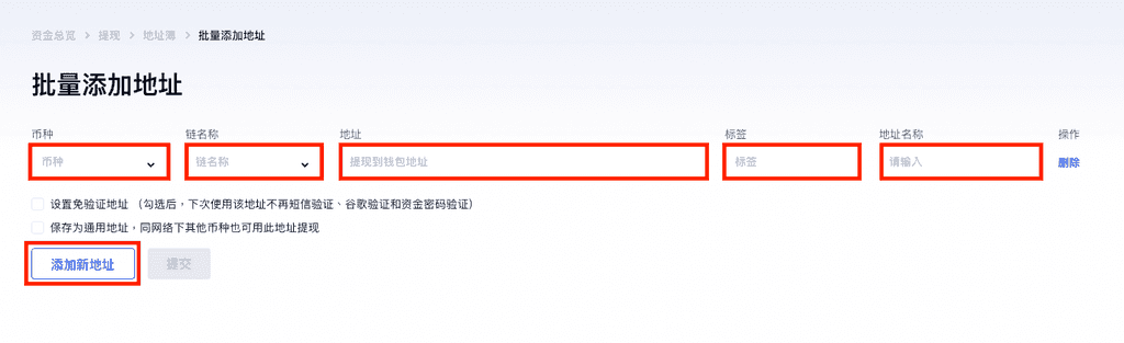 进入批量添加地址页面后,按照页面提示选择币种和网络,填入币种、链名称、正确的地址、标签(TAG 或者 MEMO,若无则不需填写)、地址名称。点选“添加新地址”可以增加新的地址栏。