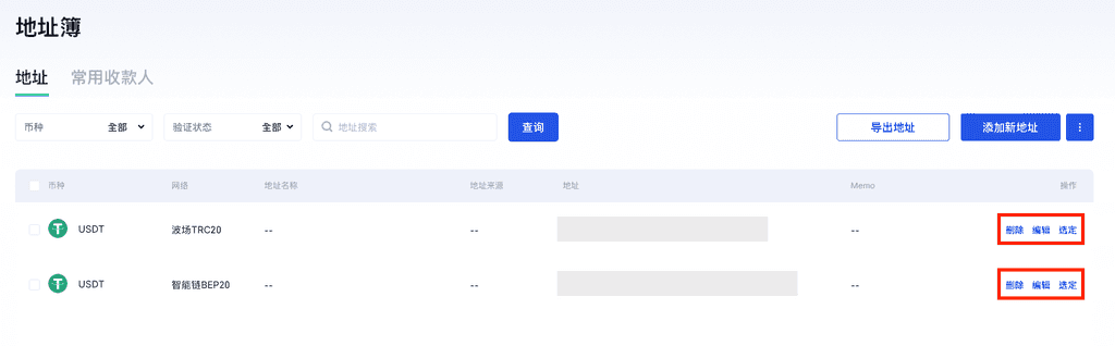 添加地址完成后,可以查看详细内容。若需要添加时,未选择设置免验证地址的或者提现到账过的地址会自动填写到此处,可点击“编辑”后勾选“加入免验证”进行验证,也可以对地址信息进行修改;若有不需要的地址或多添加地址可以点击“删除”,将此地址从免验证地址簿删除。若要使用此地址提现,则可以点击“选定”,将会跳转回链上提现。