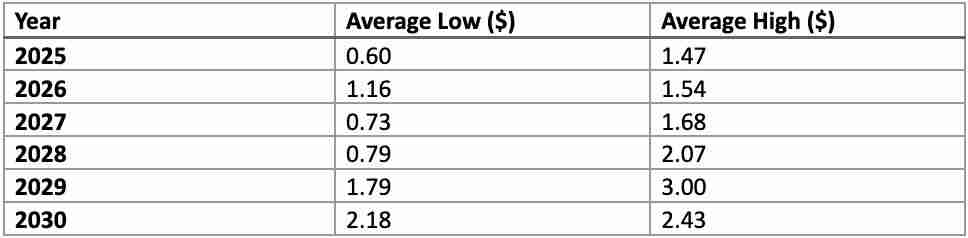 COOKIE的增长模式预计将在2029年加速。AMBCrypto预计其价格将在0.82至1.23美元之间,平均约为1.03美元。DigitalCoinPrice预计到2030年底,COOKIE的交易价格将超过2.07美元高点,最高可达2.53美元。