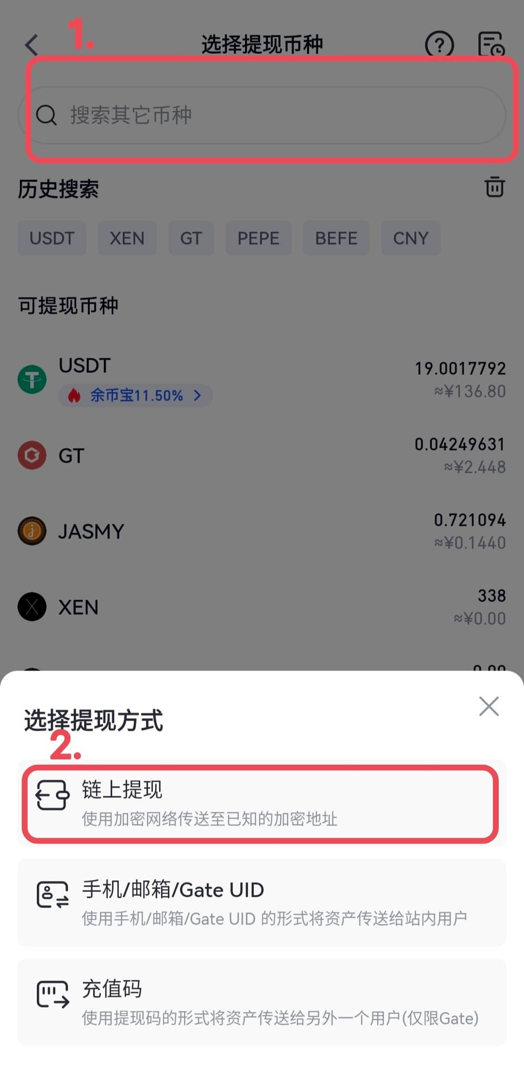 在搜索栏搜索需要提现的币种,点击该币种后面的按钮。