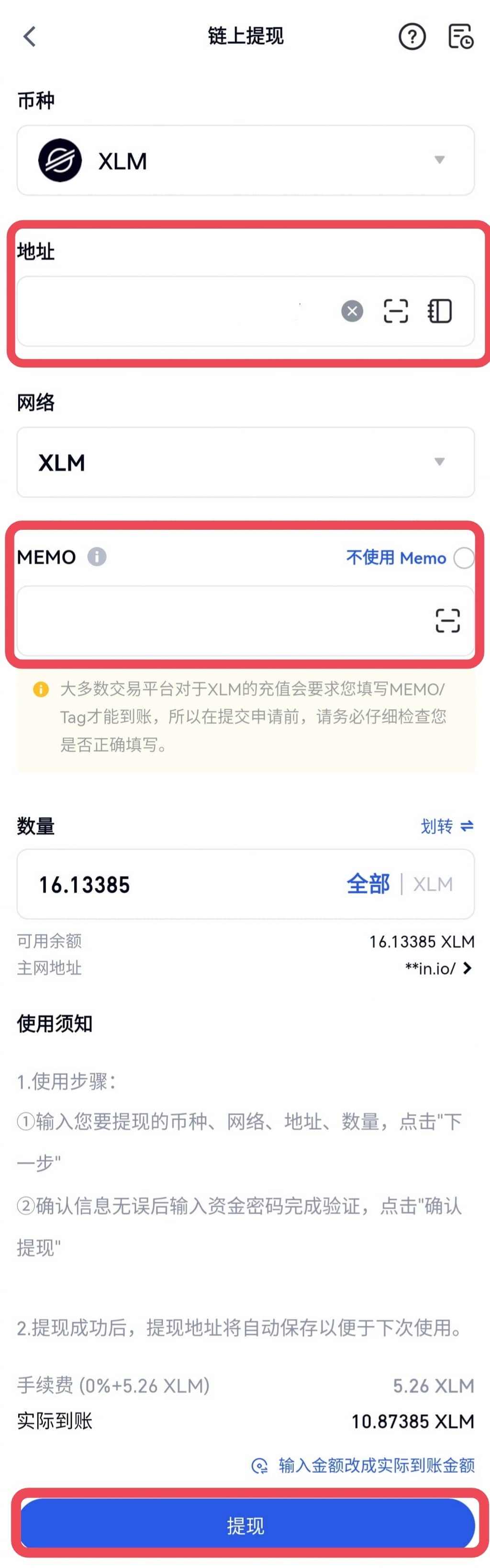 2. 手机 App 版提现方法(以提现 XLM 为例):