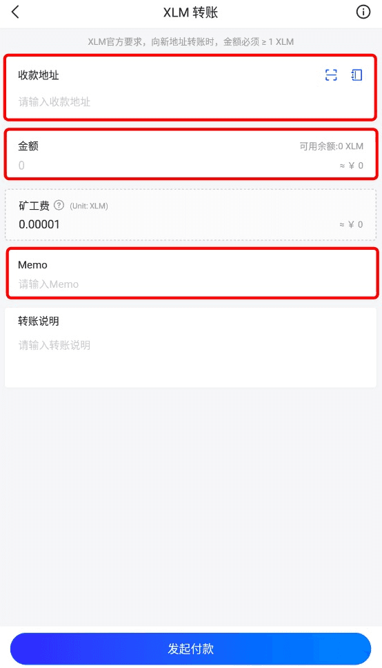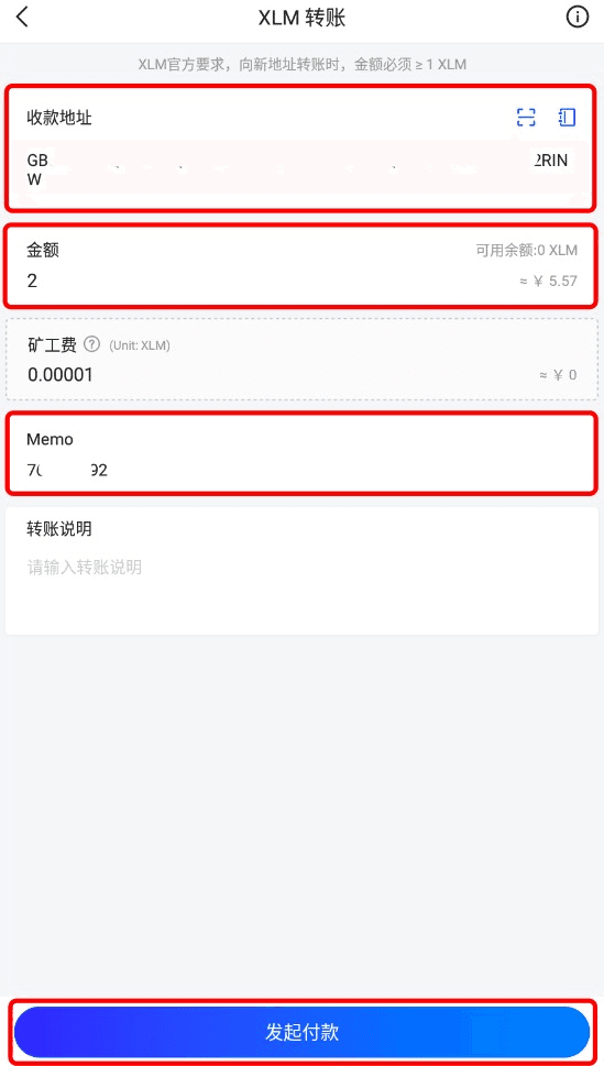 复制XLM充值地址和Memo等信息,正确填写在Wallet.io钱包中的转币页面(收款地址、Memo、转账金额),点击“发起付款”。