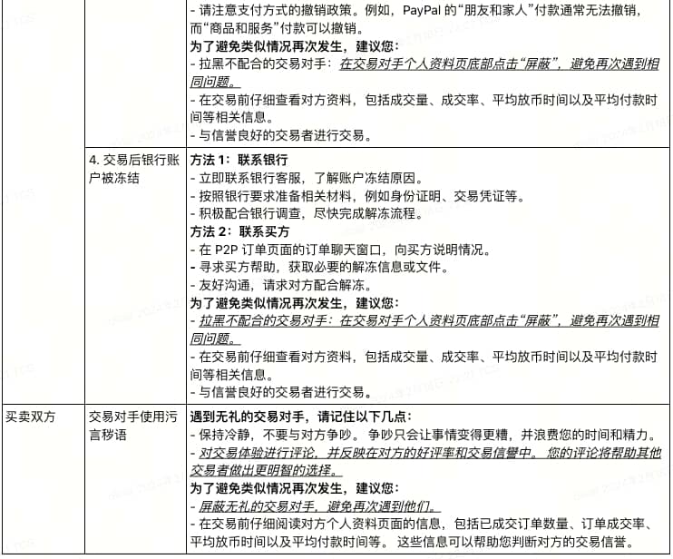 遇到 C2C 交易纠纷时,有效沟通与达成共识是解决问题的最佳方法。在此,我们愿意提供一些策略,帮助用户在求助客服申诉后能够自行处理争议。但是,请理解我们的建议并不能保证百分之百避免所有潜在的资产损失。要有效保护个人资产,遵循规定的交易指令,及时准确地执行交易是关键。