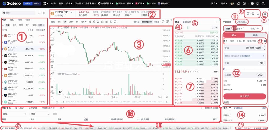 ⑯ 订单区:包括“当前委托”、“委托历史”、“成交记录”和“交易机器人”四块订单,可查看详细的订单信息;