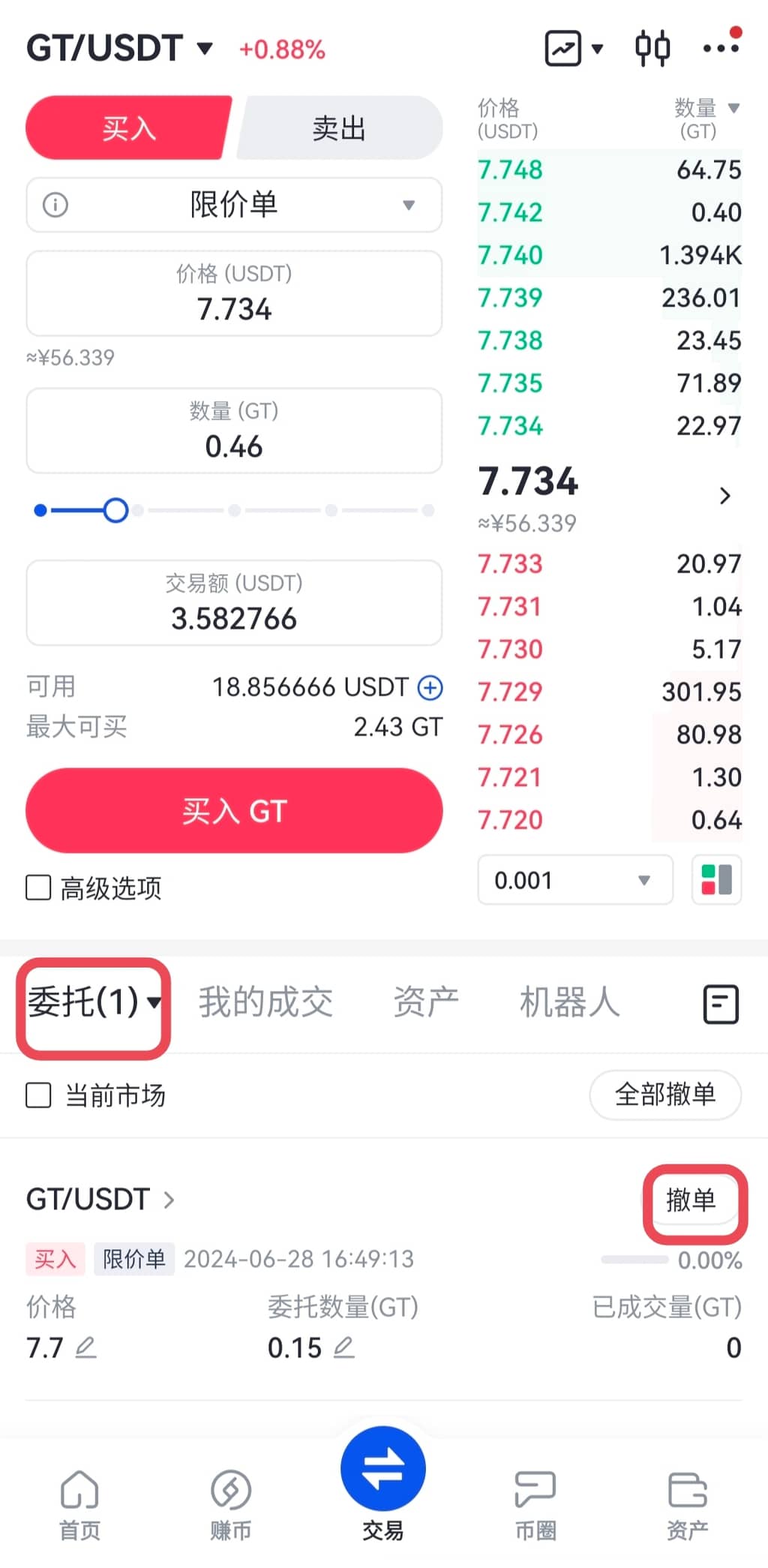 3、下单成功后,在交易页面下方的“委托”中,查看挂单情况。