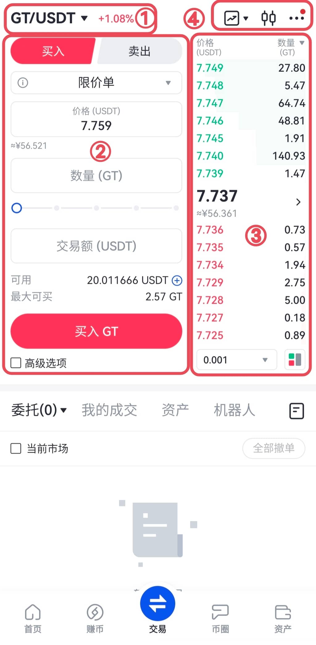 ①选择对应的交易对进行交易