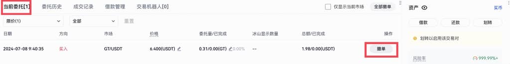 5、或者可以通过点击“手动借款”按钮进行手动借款,可以借入GT或USDT,在右下角资产区可以查看账户资金借款情况。