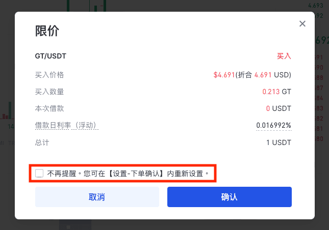 7、确认买入/卖出数量、价格、本次借款和借款日利率后,点击“确定下单”即可,若勾选不再提醒,则之后的逐仓杠杆下单则不再弹出订单确认,可点击网页右上方的齿轮图标,在设置中重新选择。