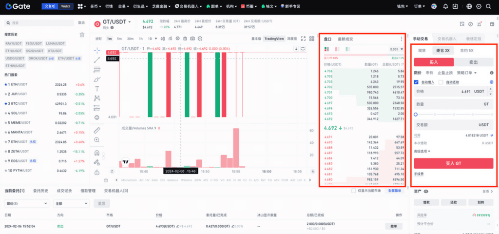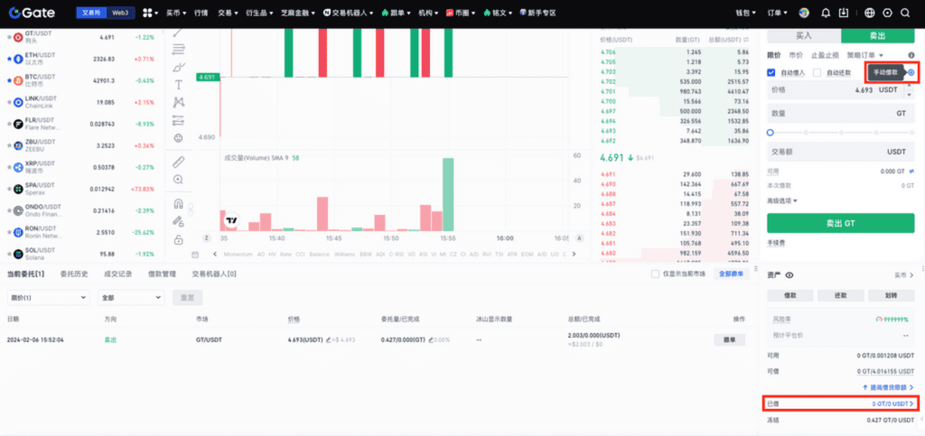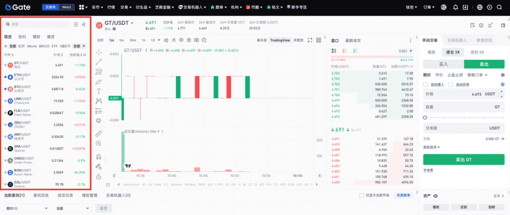 2、进入“杠杆交易”页面之后,在左侧选择对应的交易对进行交易(以GT/USDT为例)。