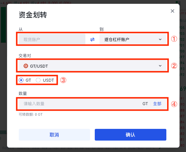 ①选择现货账户和逐仓杠杆账户划转方向; ②选择划转币种; ③输入转入/转出数量; ④点击“立即转入/转出”。