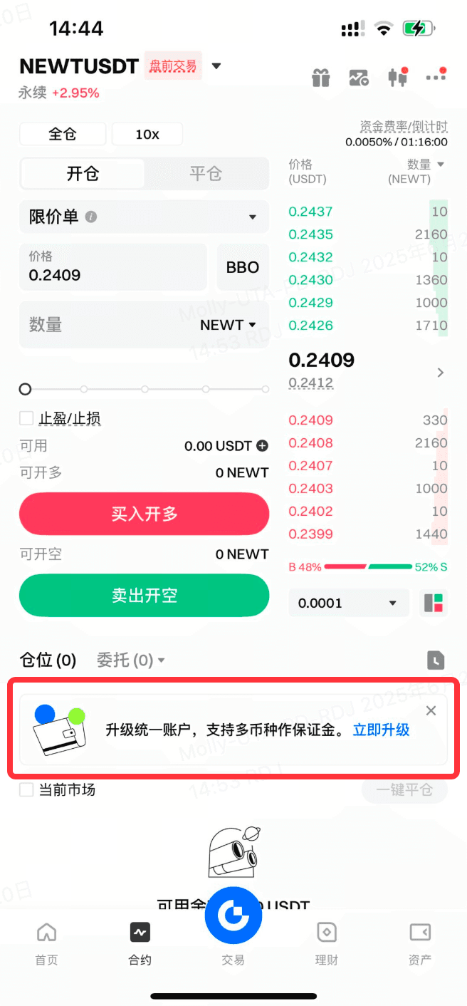 升级完成后,接下来我们就可以在一个账户中同时交易现货、杠杆以及合约,不仅避免了繁琐的资金划转动作,同时由于不同业务线间保证金共享,还能极大的提升资金利用率。