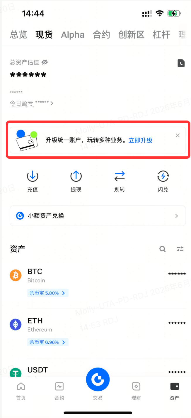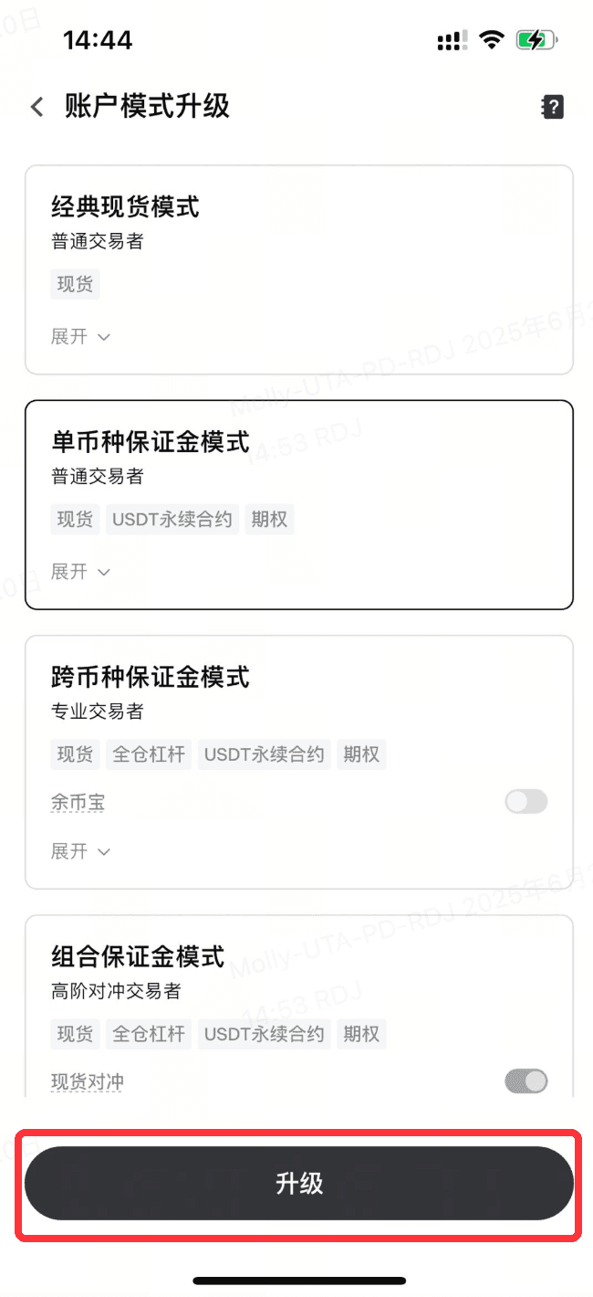 1、现货/合约下单页——点击右上角“…” 然后选择「账户升级」