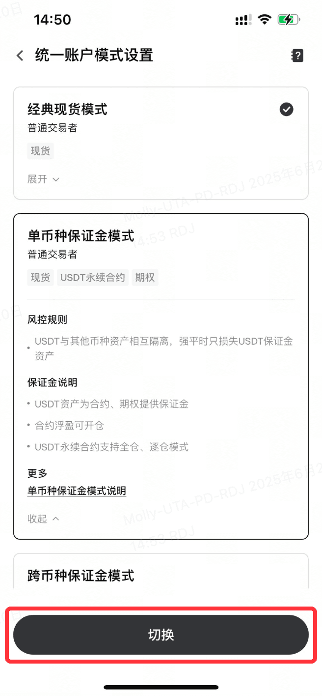 统一账户共支持4种模式,分别是:经典现货、单币种保证金、跨币种保证金、组合保证金。如果您想切换账户模式,步骤如下: