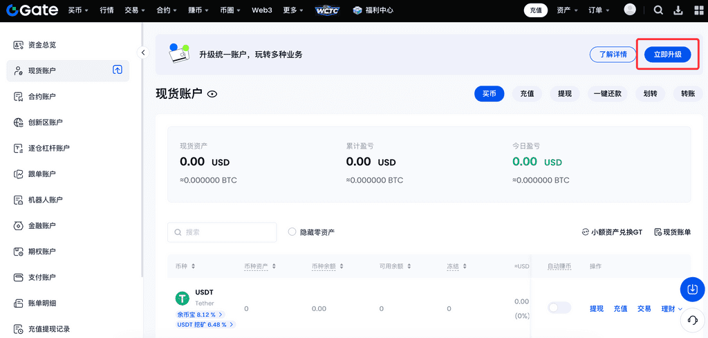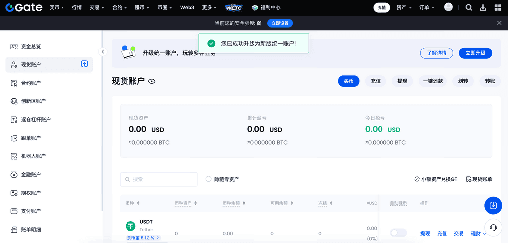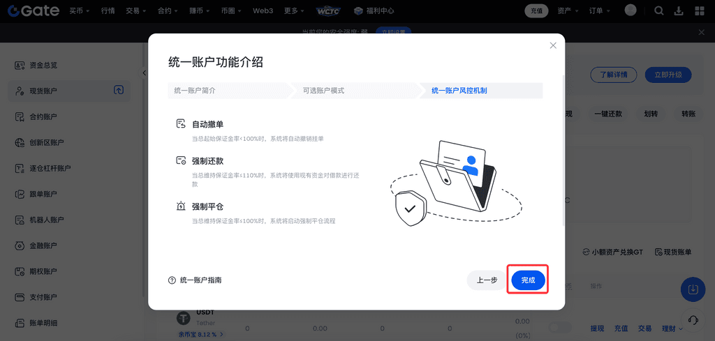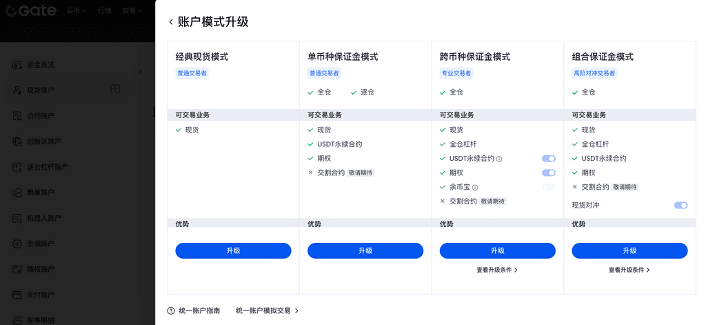 统一账户是一种集成多种交易模式的账户系统,包含经典现货、单币种保证金、跨币种保证金和组合保证金四种模式,其中经典现货和单币种保证金模式不设门槛,而跨币种保证金模式则要求现货账户总资产不低于500 USD,组合保证金模式需联系客服或大客户经理进行开通,用户可以通过现货下单页、交易设置等多个入口快速完成账户升级,升级流程包括选择账户模式、完成测试问卷、阅读用户协议等步骤,成功升级后用户可在一个账户中实现现货、杠杆及合约的交易,避免资金划转的繁琐,同时享受保证金共享带来的资金利用率提升,系统还支持自动借还功能,确保交易的便捷性与高效性,最终解释权归Gate所有。