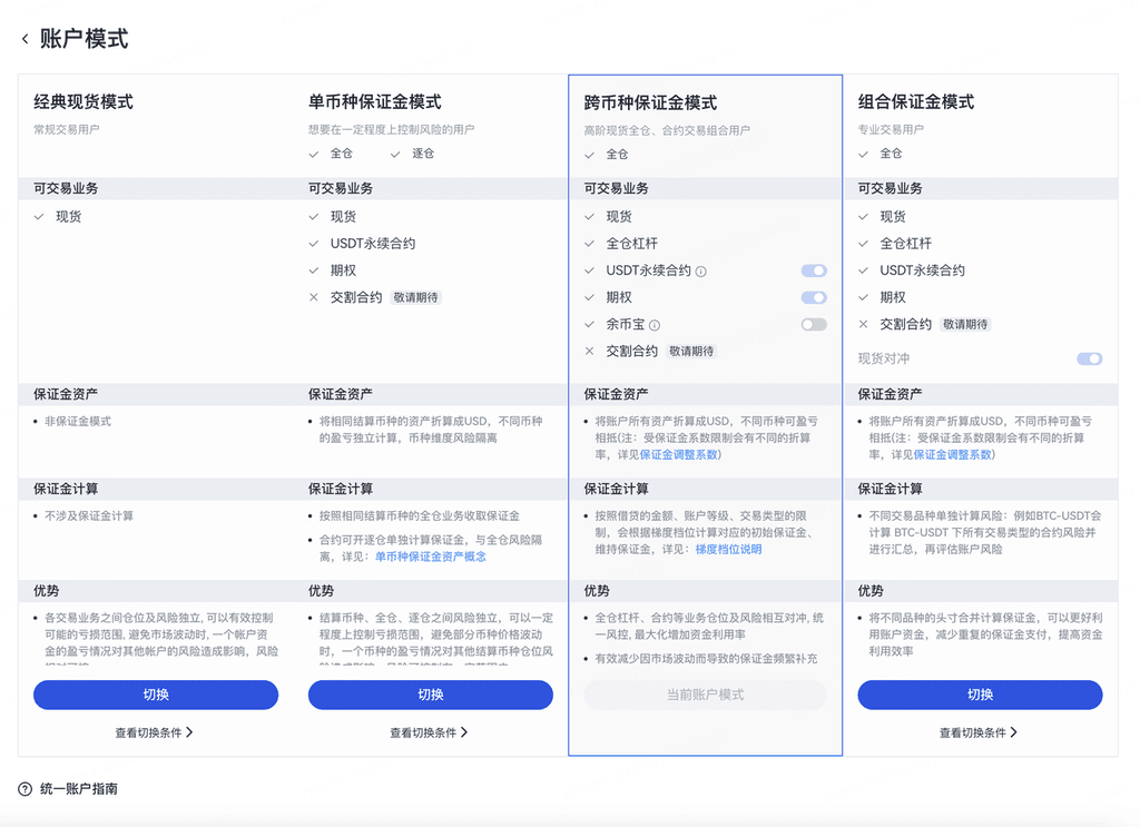 统一账户包含经典现货、单币种保证金、跨币种保证金和组合保证金4种模式。