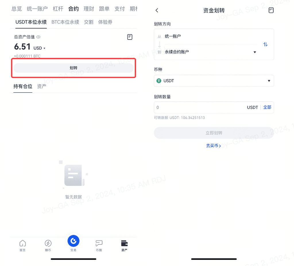 在Web端操作时,USDT本位合约和BTC本位合约需要分别在各自的交易页面或在资产/钱包内选择对应的保证金币种进行划转。