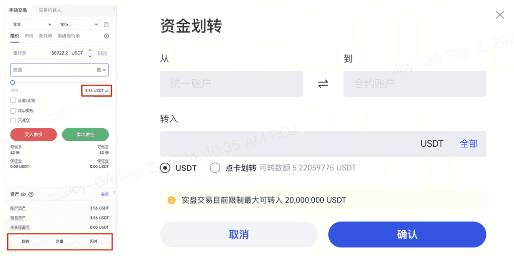 选择划转的方向、保证金币种,输入划转金额,然后点击确定即可。