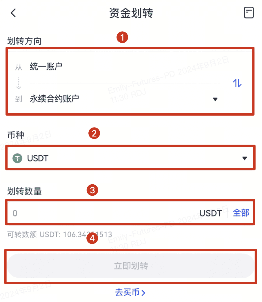 - 可以通过点击合约交易界面内“资金划转”的图标,进入二级页面。