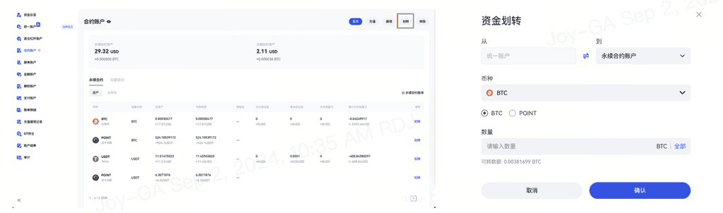 ②确认要划转的保证金币种或点卡;