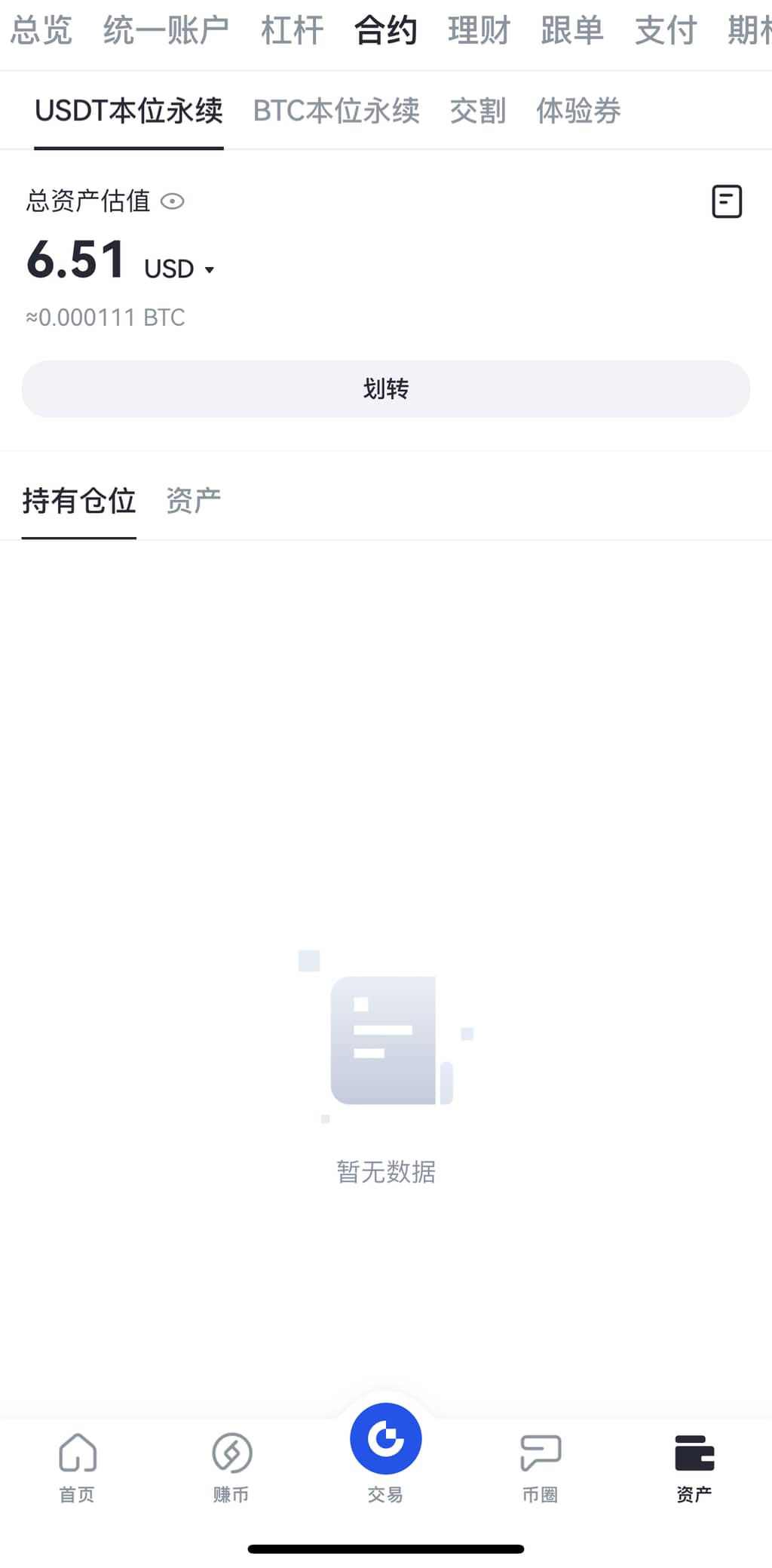 在合约交易界面的“可用”处直接查看,或者在“资产”内查看当前合约账户余额。