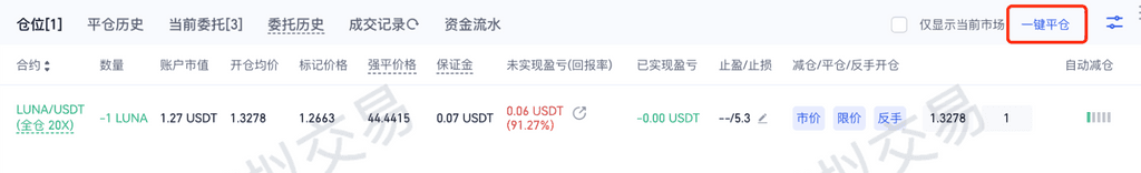 用户可以使用这一功能将所有持仓(所有交易对)一键平仓。平仓将以市场最优价格执行,并收取Taker手续费。