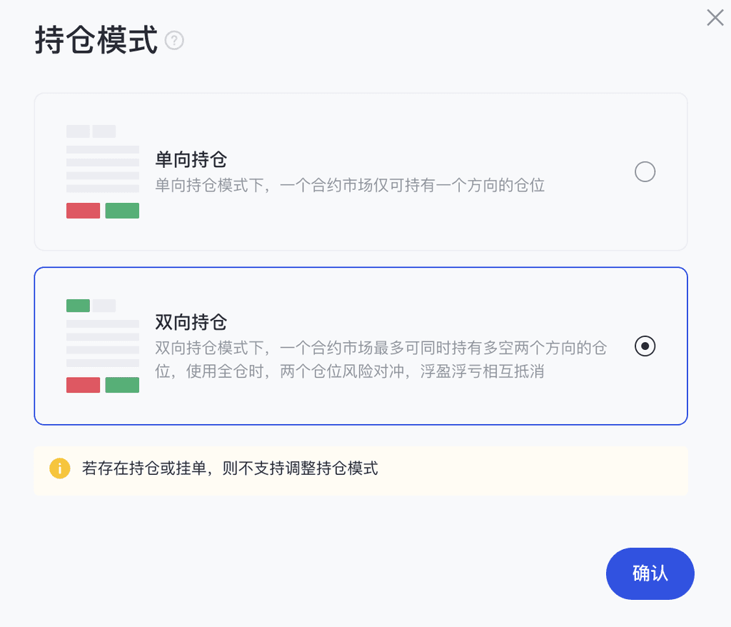点击“持仓模式”,选择“双向持仓”。请注意,切换持仓模式前,应先检查持仓和挂单状态,确认当前没有未平仓的合约和挂单。如果有,需要先平仓或取消挂单。 - 设置仓位: