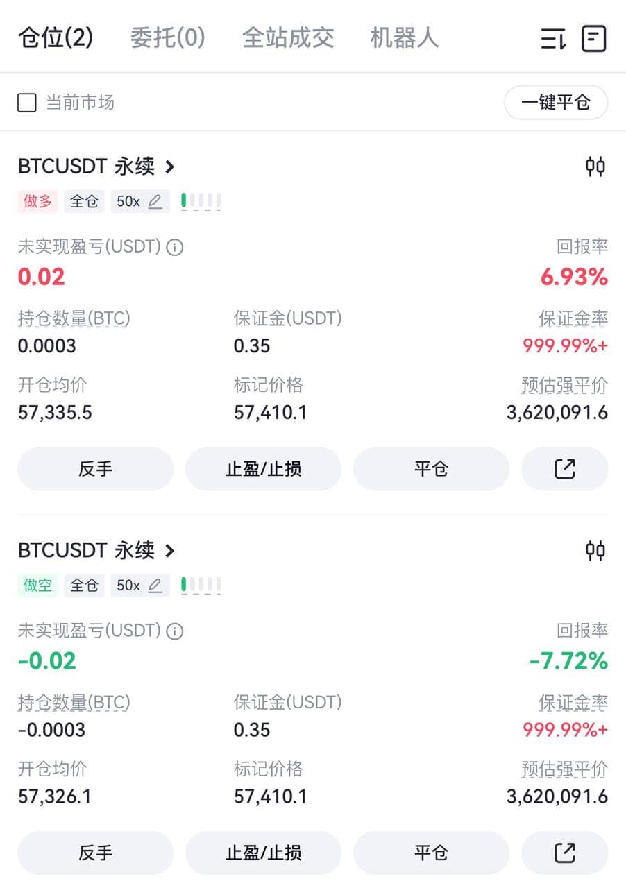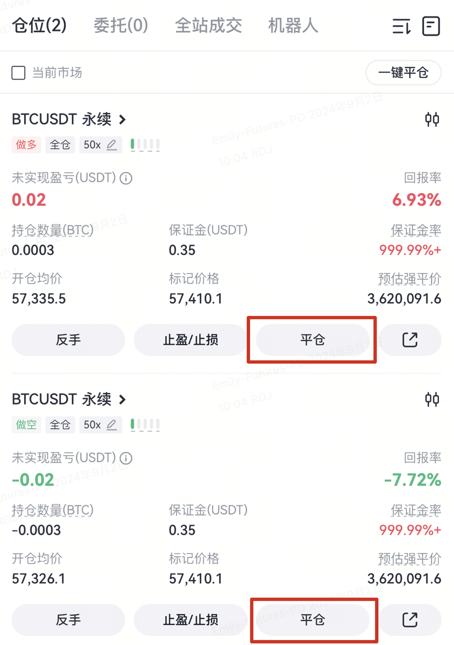 在“仓位”中,查看当前的多头和空头仓位,包括每个仓位的数量、杠杆、保证金信息等。 - 平仓操作: