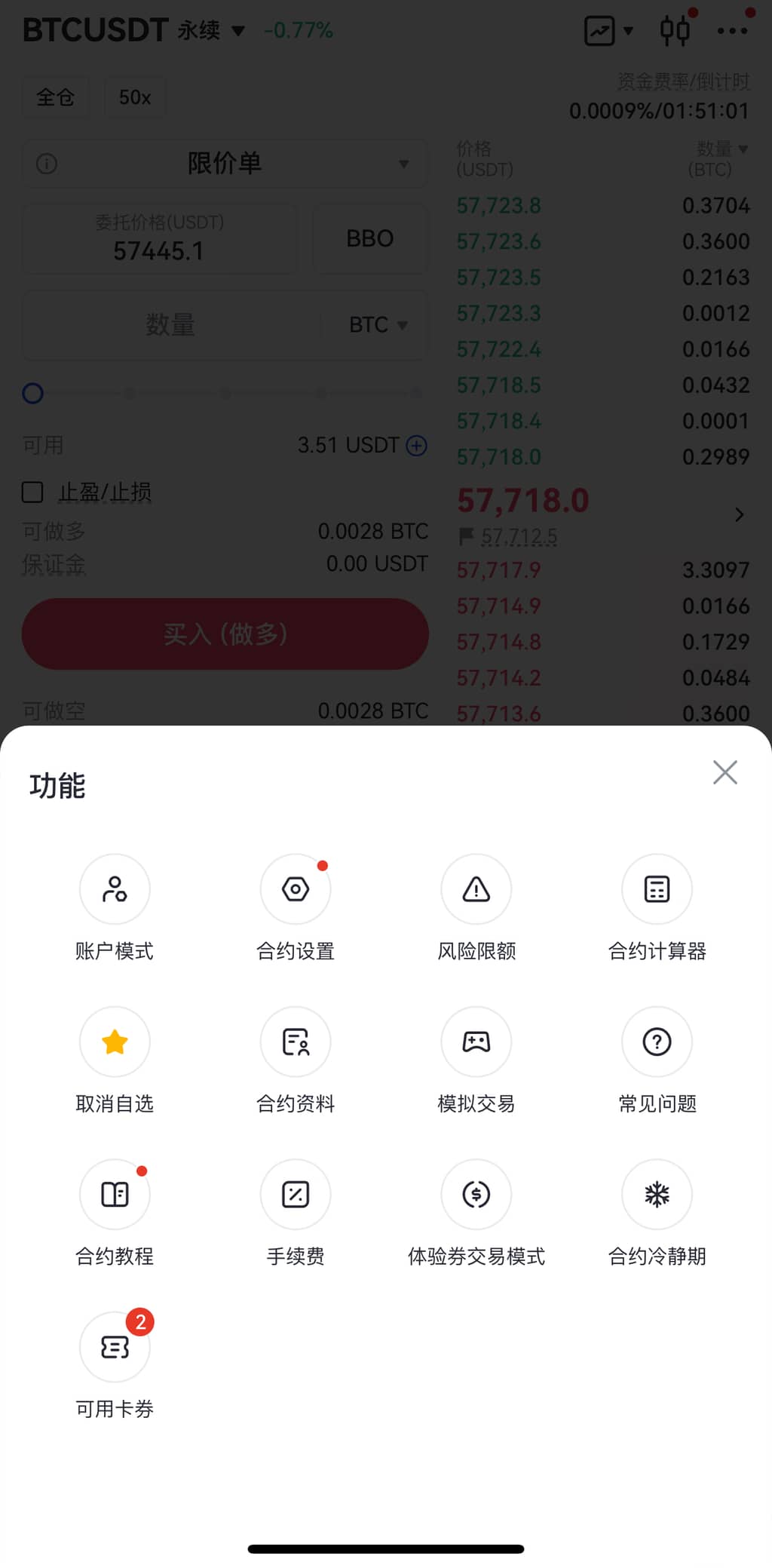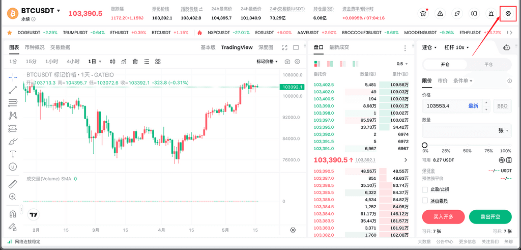 进入“合约交易区”。点击顶部导航“设置”图标。