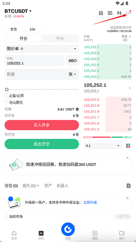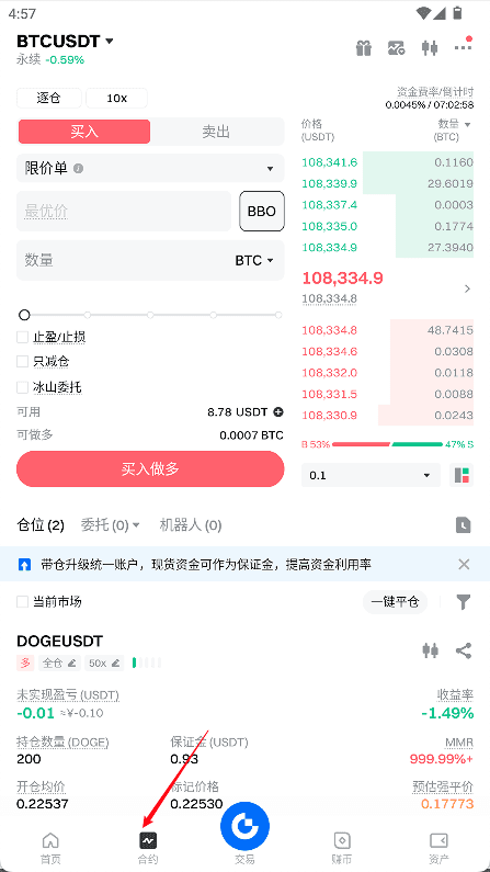 点击导航栏中的【合约】,进入合约交易页面。 启用双向持仓模式: