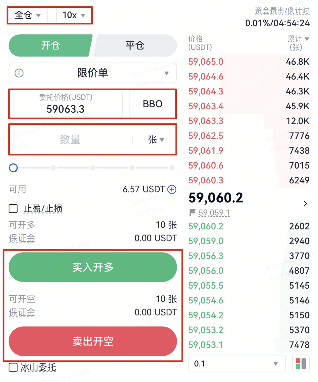 在下单区,选择杠杆倍数,输入价格、数量,并选择“买入开多”或“卖出开空”按钮进行下单。 - 查看持仓情况: