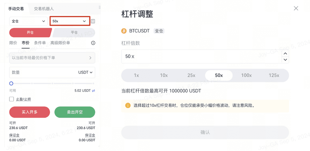 - 点击如图所示“杠杆倍数”选框,在【杠杆调整】弹窗输入所需的杠杆倍数或从选项中直接选择杠杆倍数。确认无误后,点击“确认”。