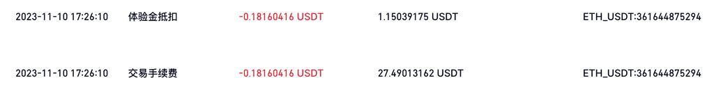 如果某一笔扣费使用合约体验金抵扣,账单流水内会显示两笔流水,分别为该笔账单类型和体验金抵扣。