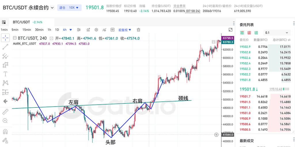 由于整个加密资产行情走势变幻莫测,极少出现教科书式标准头肩底形态,而实际行情中,多数情况会出现不规则头肩底或复合头肩形态,复合头肩模式的技术含义和普通头肩模式一样,都是转势技术形态。