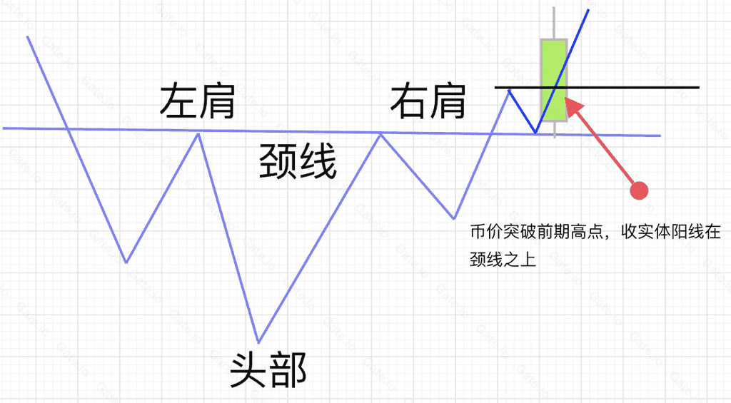 3、左肩和右肩(头部冲高反弹的高点)基本相同,将两个高点相连,即为【颈线】。最后一次拉升,币价突破颈线,则头肩底确立;