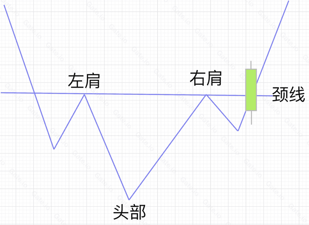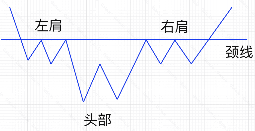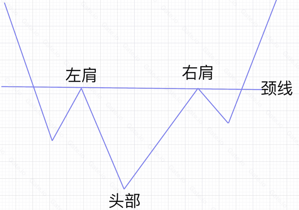 头肩底是币价大幅下跌后,形成三个明显的中间略低于两边的低谷。三个低谷从左往右,依次为左肩、头部、右肩。