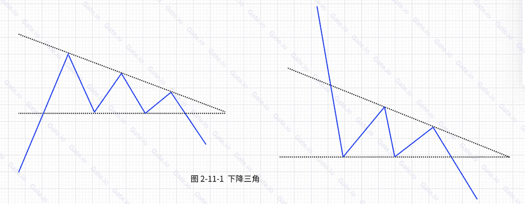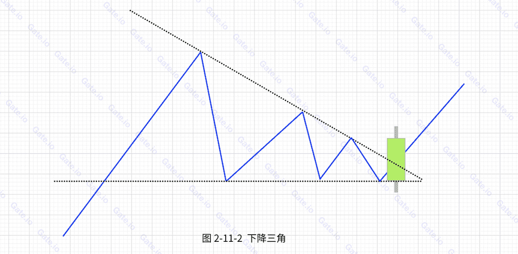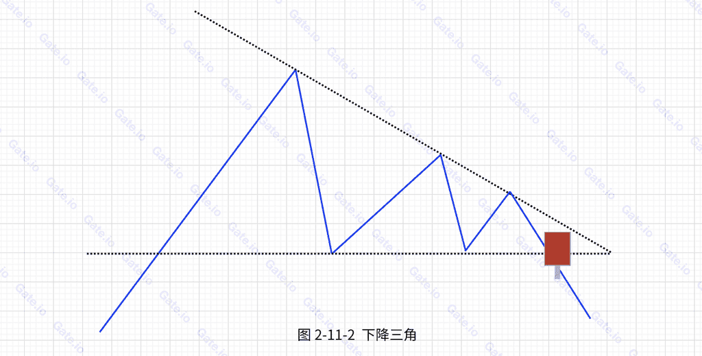 下降三角形的情形和上升三角形恰好相反。币价下跌一段时间之后,在某个特定的价位区域上出现稳定的购买力,价格每次回落至该水平就止跌回升,连接每一个低点就形成一条水平的直线。