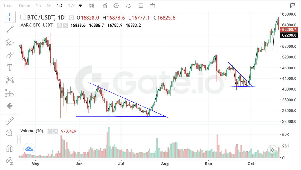 上图是 Gate合约BTC日线图,在 2021-6-15 至 2021-7-21 期间,BTC 从最高 58000 美元跌至 30000 美元附近,而后横盘整理。在一波反弹至41000 美元附近后,开始整理走出一个收敛的下降三角形态。当币价上涨至 32500 美元时,突破了下降三角的上边线后,走出一波凌厉上涨行情,开启了本轮牛市的第二波行情。