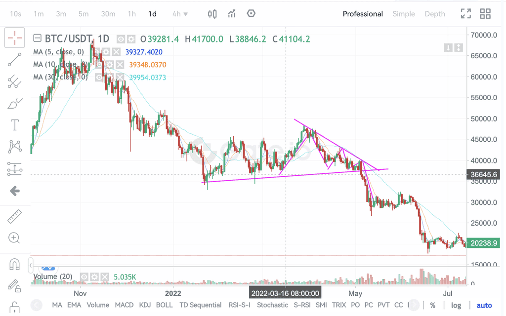 上图显示了 Gate BTC 期货的日烛台,涵盖了 2021 年 1 月 23 日至 2021 年 5 月 1 日。BTC 从 66,000 美元的峰值大幅下跌,触底至 35,000 美元,然后在 35,000 美元至 35,000 美元之间波动。 47,000 美元。随着多头和空头之间的平衡趋于平衡,出现了一个聚合三角形。一旦代币价格跌破 37,000 美元,突破三角形下限,就预示着市场新的看跌阶段的开始。