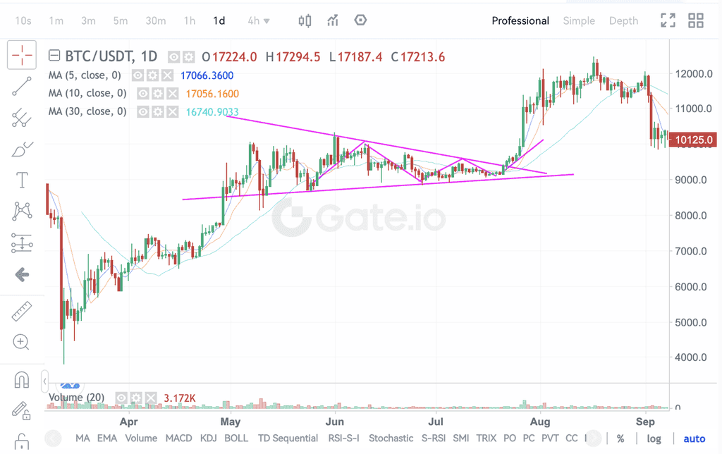 上图为Gate BTC期货的日烛台形态,涵盖2020年4月29日至2020年7月27日期间。从2020年3月开始,BTC开始强劲上涨趋势,从5000美元左右上涨至峰值上方2020 年 6 月 11 日达到 10,000 美元。然后在这些较高水平上振荡,趋势逐渐收敛,最终形成明显的收敛三角形模式。 2020 年 7 月 21 日,该代币的价格飙升至 9,500 美元以上,突破了收敛三角形的上限,从而为显着的看涨趋势铺平了道路。