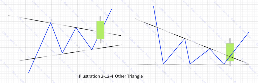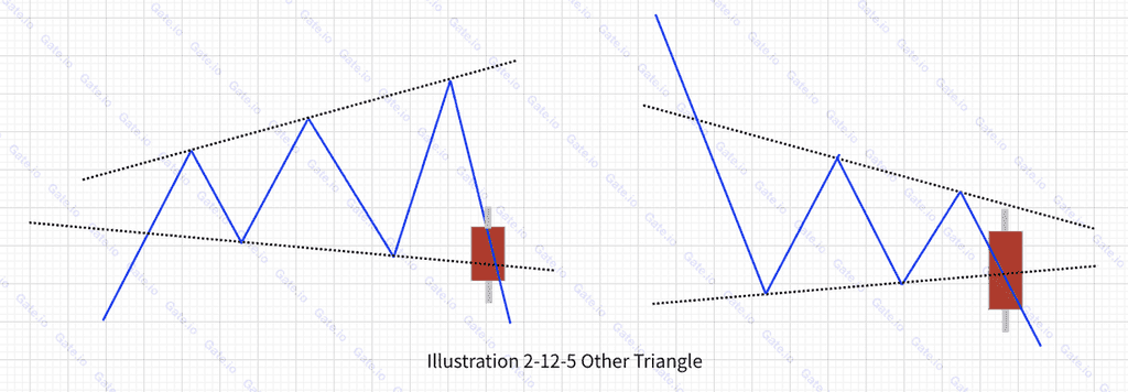 除了前几节讨论的上升和下降三角形之外,在实际交易中偶尔还会出现各种其他三角形形式。这些带有重要的交易信号。值得注意的是,这些包括基本三角形、发散三角形(形状像扩音器)和会聚三角形。示例如下图所示:
