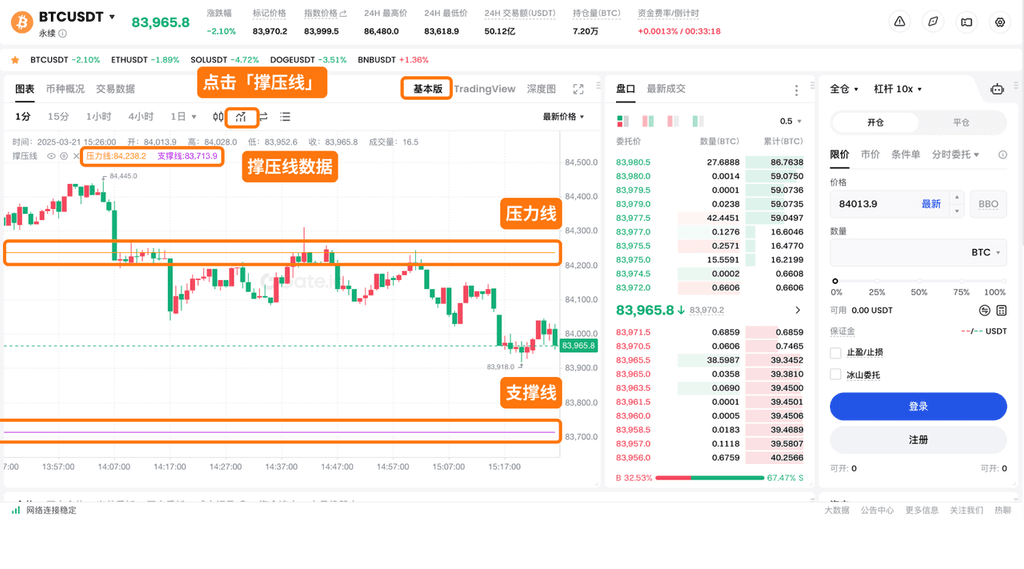 撑压线指标(Support and Resistance Lines, SRL)是一款结合BOLL20和AI算法的智能交易工具,旨在帮助用户快速识别市场中的支撑线和压力线,以辅助交易决策,支撑线代表价格下跌时可能遇到的买入区域,而压力线则是价格上涨时可能遇到的卖出区域,用户可以根据这些信息判断价格的运行区间,设置止盈止损点或优化交易策略,应用场景包括实时市场分析和交易决策,App和Web端均可使用,用户可根据需求设置最多5条支撑线和压力线,系统会自动计算并显示,值得注意的是,Web端目前仅支持1条支撑线和1条压力线,撑压线会随市场波动实时更新,用户需结合其他技术指标进行综合判断,以提高交易成功率,通过该指标,用户能够更高效地把握市场机会,优化投资策略。