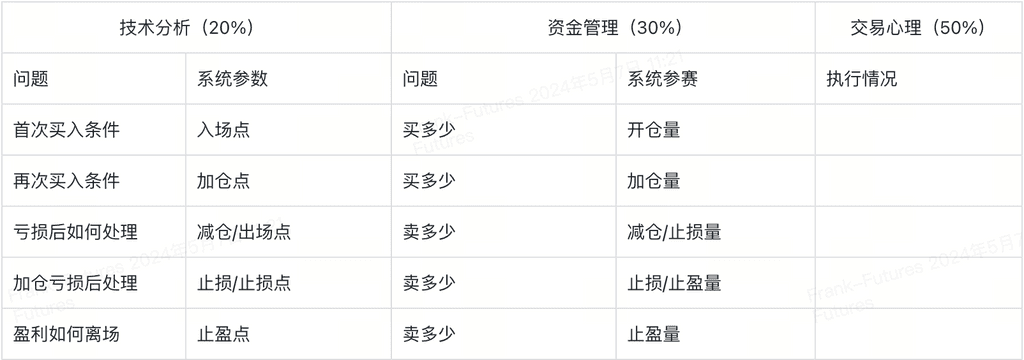 交易系统包括三个组成部分,分别是技术分析、资金管理和交易心理。这些是决定系统交易成功的三大关键因素。