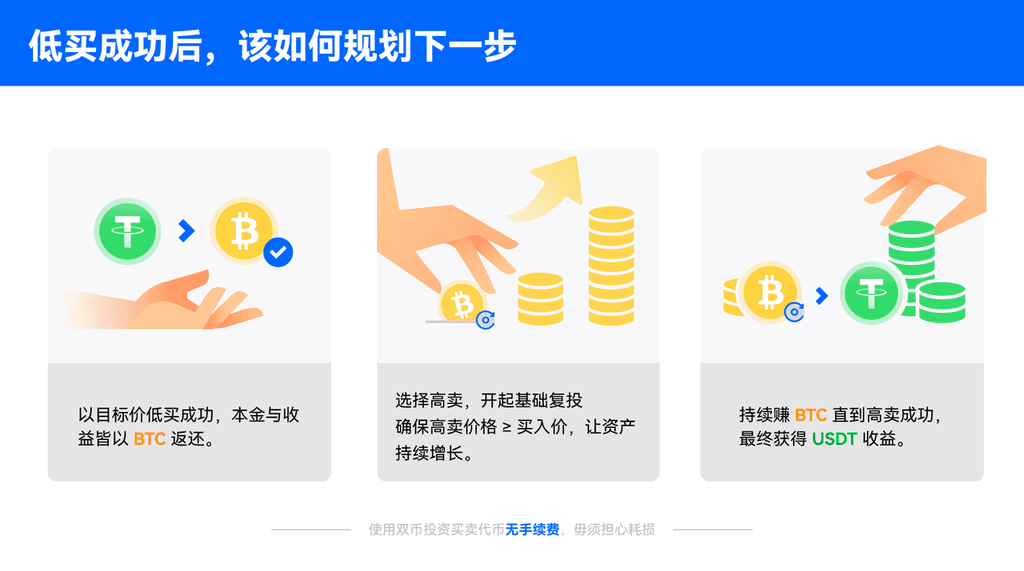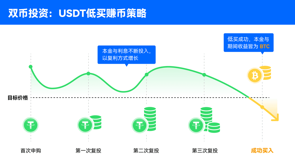 双币投资是一种创新的金融工具,旨在帮助用户通过预判市场趋势,以设定的目标价在未来低买或高卖代币,用户不仅可以享受零手续费的交易体验,还能获得丰厚的利息收益,双币投资的主要优势包括提供稳定的赚币机会、高收益的低买/高卖策略以及交易过程中的无滑点操作,用户可以通过低买策略在无法把握进场时机的情况下依然获得收益,此外,自动复投功能让USDT低买策略持续运行,未成功低买时也能赚取利息收益,形成可持续的资产增长模式,基础模式下,用户能够以固定价格自动运行低买策略,成功后将本金与利息转化为BTC,进一步通过复投实现资产的复利增长,双币投资为用户提供了多样化的投资选择和灵活的操作方式,是加密货币投资者不可或缺的工具。