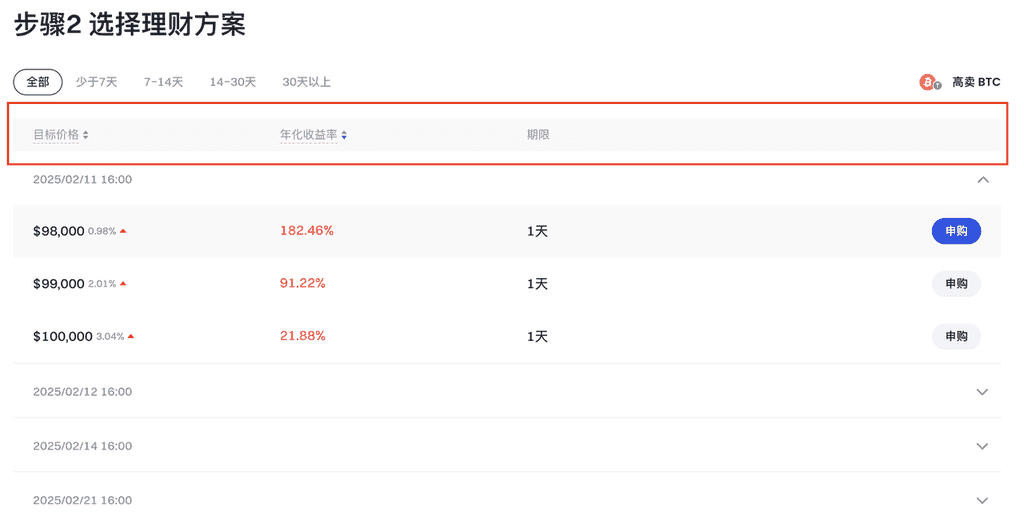 以 BTC 理财为例,在“BTC版块”选择“高卖”,根据“目标价格”、“年化收益率”、“期限”等信息,按需选择产品,点击右侧【申购】。