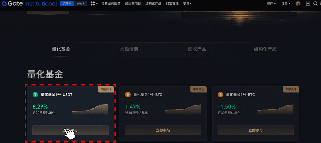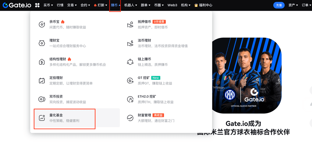 1、登录Gate官网,在导航栏选择赚币——量化基金,即可进入量化基金页面。