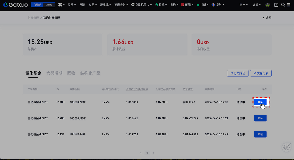 在Gate官网上,用户可以通过导航栏选择“赚币”进入量化基金页面,找到心仪的币种(如USDT)后点击“立即参与”,在弹窗中输入申购数量并确认,即可完成申购,申购成功后可前往持仓页面查看订单信息,若需查看申购记录和收益情况,可在“我的财富管理”页面进行查询,支持随时赎回,赎回金额为订单最大金额,发起赎回后不可撤销,赎回成功后实时到账,若触发风控上限则需人工审核,审核周期为T+1天,赎回后可在交易记录中查看收益,所有操作流程简单明了,确保用户能够便捷地进行量化基金的投资与管理。